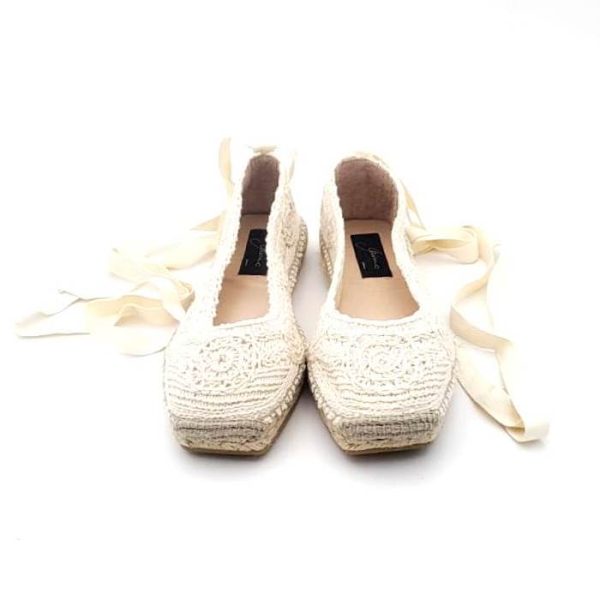 Alpargata para mamas con cintas 100% algodón con diseño con ganchillo para mamás. Totalmente forradas y con cierre cintas que se anudan alrededor de la pierna o del tobillo para una perfecta sujeción para mamás. Realizada en 100% algodón en color crudo con diseño con ENCAJE y acabados de primera calidad. Son perfectas para complementar los looks más elegantes en todas las ocasiones especiales como bodas, comuniones o bautizos esta primavera-verano. Combinan con todo. Son muy cómodas y confortables.
