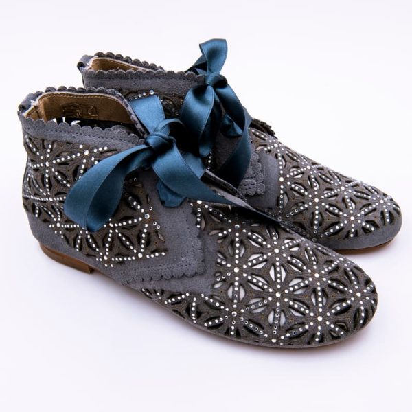 Botín clásico de vestir para CEREMONIA en ante con piedras de swarosky, ante y picado para una mayor elegancia en el pie de tu niña. Muy elegantes para vestir esta primavera verano y para ocasiones especiales. Realizada en 100% ante natural de primera calidad. Con cierre con lazos de grosgrain para una mayor sujeción.