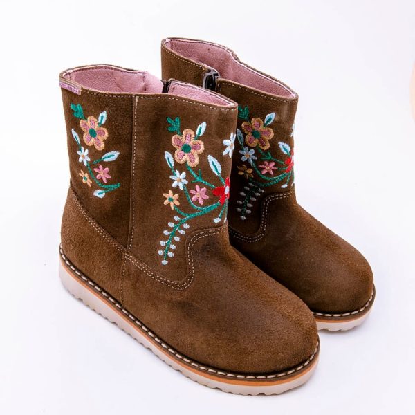 Bota en piel serraje con cremallera en el lateral. Incluye un precioso bordado en el frontal que hace que la bota sea muy divertida. Tiene un ancho especial para poder poner el pantalón por sentro si se desea.
