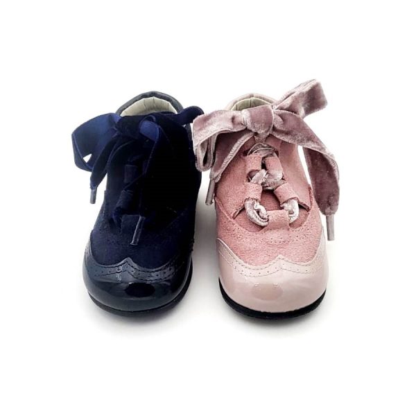 Botita clásica para bebés  tipo inglesita o galesa  con cordones de terciopelo en piel serraje y puntera en charol . Realizada en 100% piel natural suave serraje con acabado de primera calidad. Un básico totalmente diferente, renovado y muy elegante, que combina con toda su ropita en cualquier temporada del año. Son un modelo muy dulce y elegante para diario y con todos sus looks.