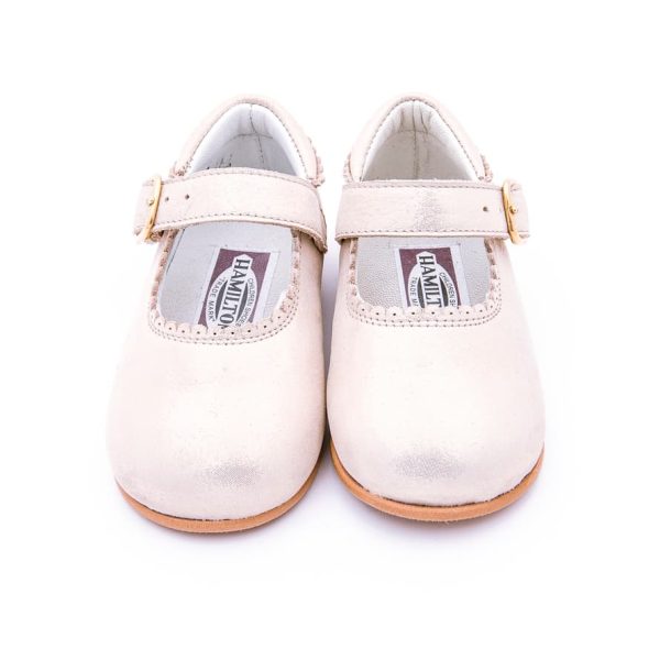 Mercedita en napa con cierre en hebilla y brillos dorados de la casa HAMILTOM. Fabricada 100% en piel napa natural de primera calidad con acabado metalizado. La suela es de goma de primera calidad antideslizante y muy flexible que la hacen muy cómoda. Forradas interiormente en piel, con plantilla tambén en piel para la correcta transpiración de sus pies. Este modelo clásico de mercedita, con un precioso festón y acado metalizado, te permitirá combinarla perfectamente con los looks mas chics para esos eventos más especiales de tu niña. Auténtico Hamiltom fabricado 100% en España con los mejores materiales.