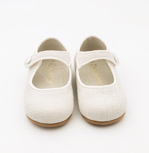 Mercedita zapato clásico de vestir para CEREMONIA en lino para niñas. Muy elegantes para vestir esta primavera verano y para ocasiones especiales. Realizada en 100% LINO natural de primera calidad. Con cierre con botón y rivete de grosgrain . Esta mercedita es ideal para cualquier evento para esta primavera verano.