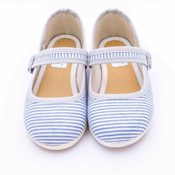 Mercedita con diseño en mil rayitas azules en lona algodón piqué con cierre de hebilla y suela a tono para niñas pequeñas. Realizada en Lona 100% algodón piqué y acabados de primera calidad. Combinan con todo esta primavera-verano. Son un básico para esta temporada.