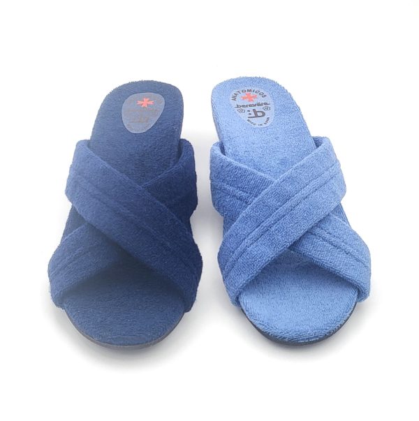 Zapatilla Abierta Para casa con tiras cruzadas y cuña en el talón. Fabricada en algodón 100% para una correcta transpiración y adaptables al pie por su forma de cruz en el empeine que se adapta a todos los pies . Suela de goma antideslizante para una correcta pisada.