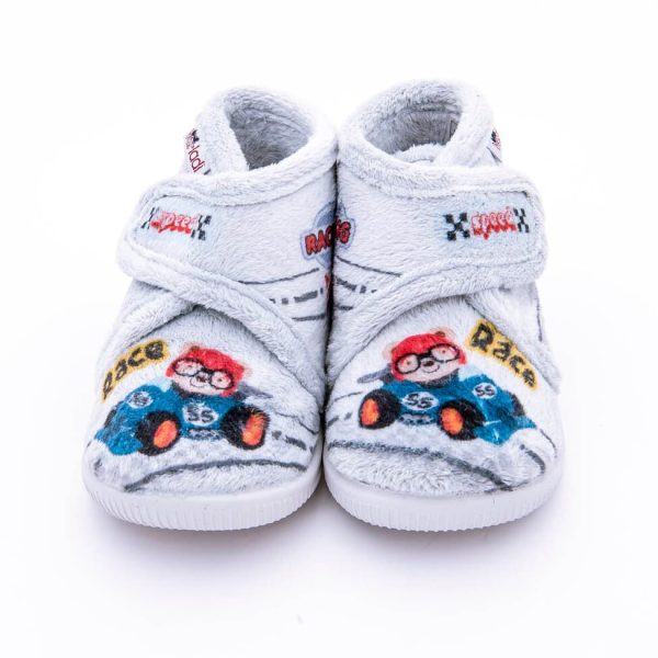 Zapatilla botita para casa de niños con diseño de coches con cierre de velcro y con suela de goma.
