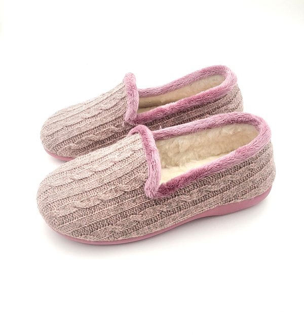 Zapatilla cerrada de punto con dibujo de ochos con borreguito blanco.