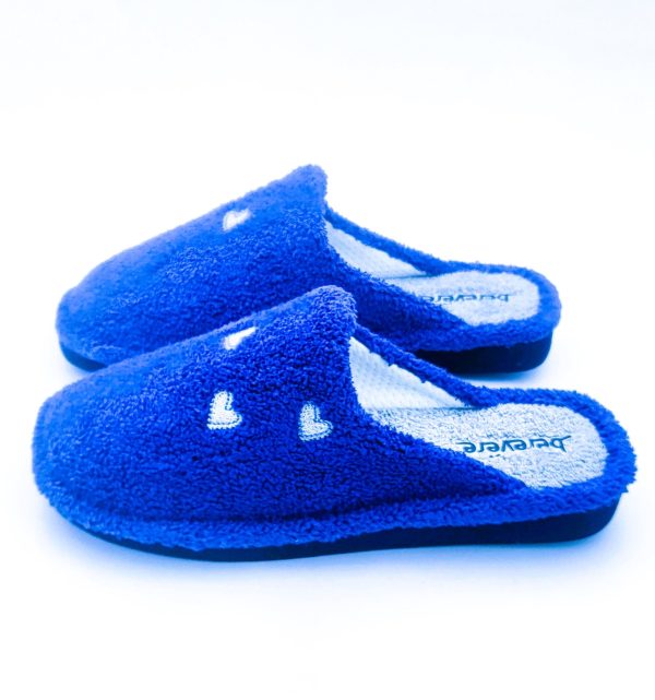 Zapatilla de casa fabricada en toalla sin talón y con dibujos de corazones y suela microporosa silenciosa.