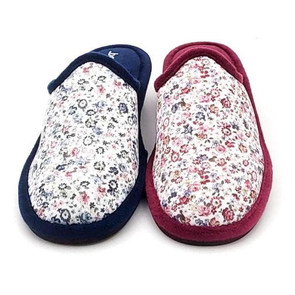Nuevas Zapatillas para casa abiertas en algodón natural suave para mamás. Realizadas en 100% textil suave y acabados de primera calidad. Muy confortables y calentitas para estar en casa este otoño-invierno. Son un modelo con 2 cm de tacón tipo zueco y con diseño de florecitas de Liberty y con suela de goma al tono, quedan muy bonitas con todos los pijamitas para esta temporada de otoño invierno. Son un modelo muy utilizado para poder pisar la cocina sin estropear la suela y además este modelo viene con plantilla acolchar por lo que da un mayor confort