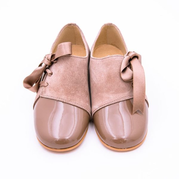 Precioso zapato combinado en ante con puntera en charol y cordones de lazo.